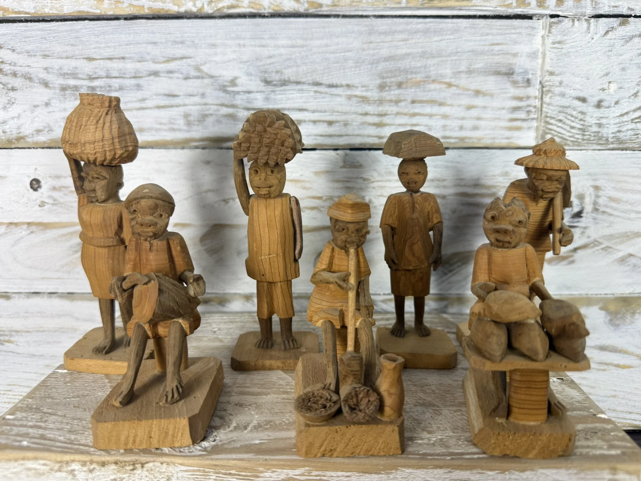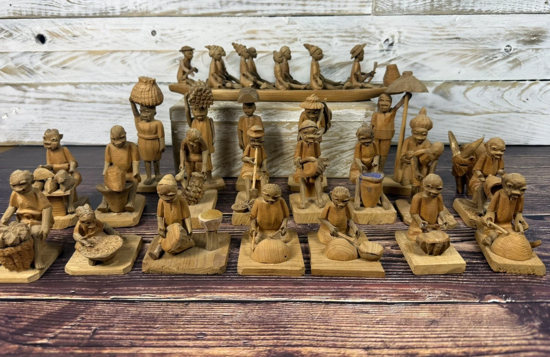 Carved from thorn wood, a dense but fragile material, these figures were produced individually by hand. Each carries subtle variations in posture, expression, and proportion, giving the group a strong sense of rhythm and narrative when displayed together.